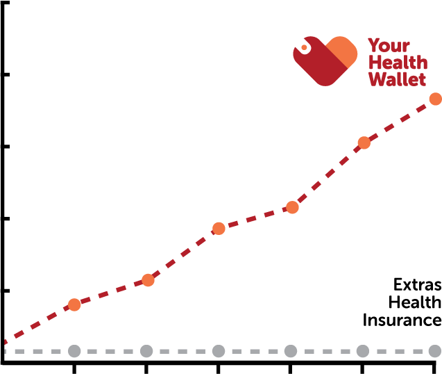 *For the sake of simplicity, annual extras health insurance premium hikes and interest paid on funds held by Your Health Wallet are not factored into the comparison chart due to their variability. Premiums paid are calculated at $5/day as it is the minimum with Your Health Wallet. All Your Health Wallet fees are charges have been debited to ensure it complies with the PDS that applies to Your Health Wallet. All fees and charges levied by Your Health Wallet are deducted for the period calculated. GAP is calculated at 49.11% based on APRA Sept 21 quarter data.